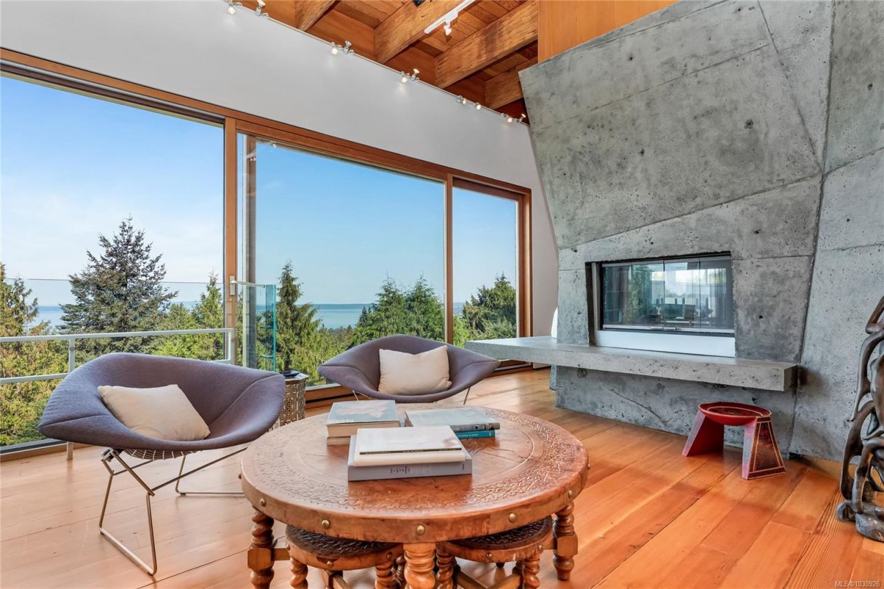 Available for the first time 'Boulder House is an architectural and sustainable-design icon. This one-of-a-kind residence seamlessly integrates with its .45-acre landscape, boasts 180° Salish Sea views. Natural light, exposed engineered fir beams, reclaimed fir floors with radiant heat, a dramatic see-through concrete crystal-inspired fireplace, and custom cabinetry are among its hallmarks. The chef's kitchen features sculptured, building block-design cabinets, natural granite countertops, and premium appliances. The primary suite offers a private terrace and a spa-inspired ensuite. A two-car garage, elevator, rooftop deck offer more;...read more